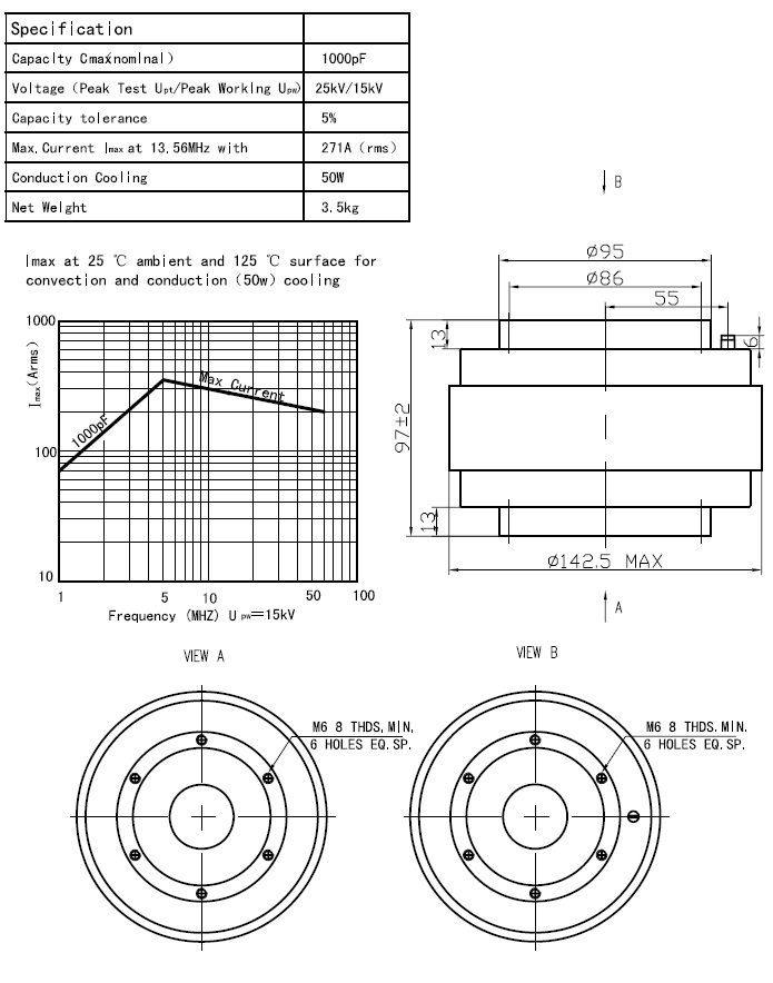 CKT1000/17.5/271固定陶瓷高压真空电容器采用陶瓷外壳、真空介质、具有耐压高、体积小、Q值高、性能稳定可靠价格低廉等特点,广泛用于感应加热、介质加热、通讯、广播等设备。