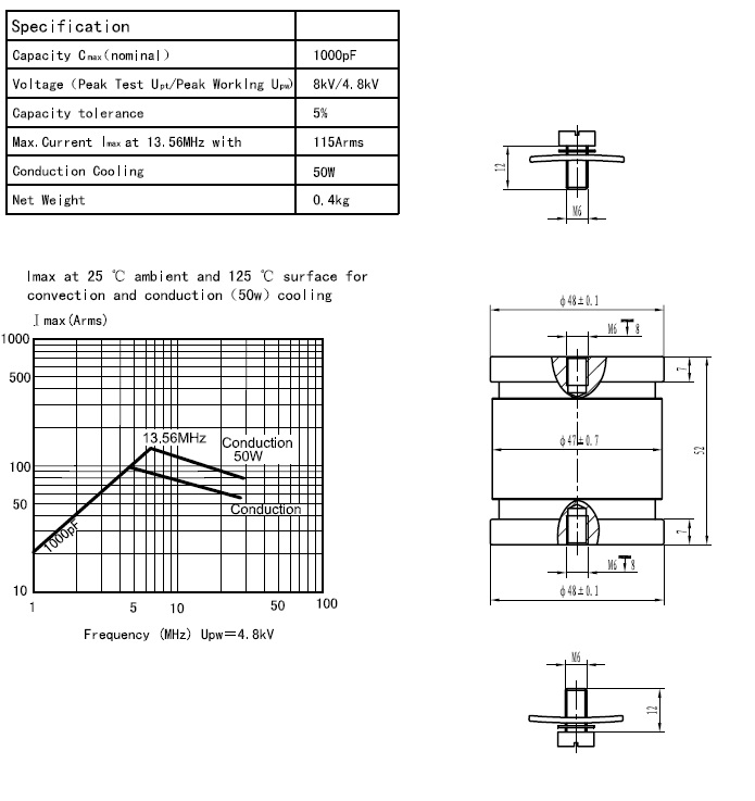CKT1000/5.6/115固定陶瓷高压真空电容器采用陶瓷外壳、真空介质、具有耐压高、体积小、Q值高、性能稳定可靠价格低廉等特点,广泛用于感应加热、介质加热、通讯、广播等设备。