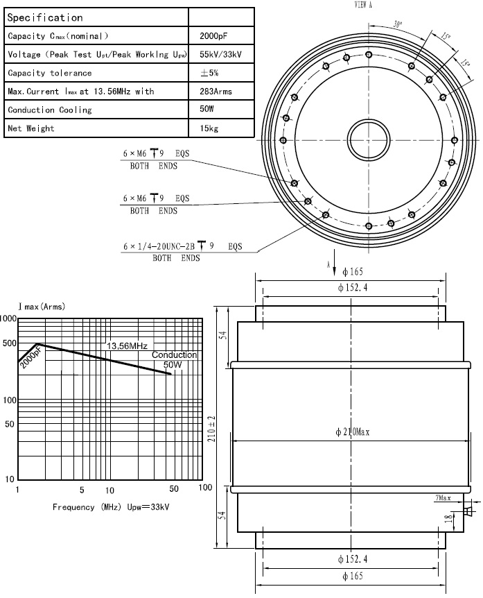 CKT2000/33/400型固定陶瓷高压真空电容器采用陶瓷外壳、真空介质、具有耐压高、体积小、Q值高、性能稳定可靠价格低廉等特点,广泛用于感应加热、介质加热、通讯、广播等设备。