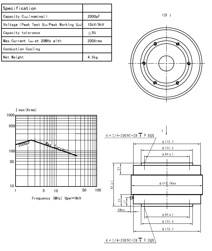 CKT2000/10/200 型固定陶瓷高压真空电容器采用陶瓷外壳、真空介质、具有耐压高、体积小、Q值高、性能稳定可靠价格低廉等特点,广泛用于感应加热、介质加热、通讯、广播等设备。