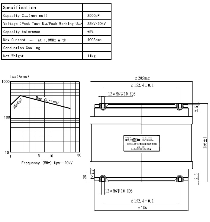 CKT2500/20/400固定陶瓷高压真空电容器采用陶瓷外壳、真空介质、具有耐压高、体积小、Q值高、性能稳定可靠价格低廉等特点,广泛用于感应加热、介质加热、通讯、广播等设备。