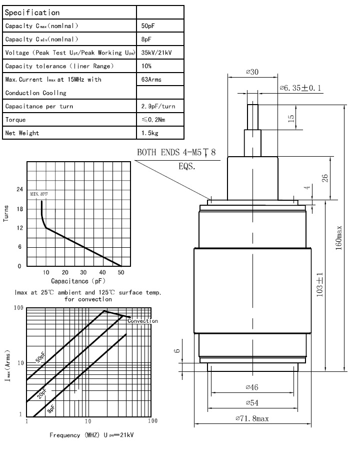 CKTB50/25/63型可变陶瓷高压真空电容器采用陶瓷外壳、真空介质、具有耐压高、体积小、Q值高、性能稳定可靠、价格低廉等特点,广泛用于感应加热、介质加热、通讯、广播等设备。