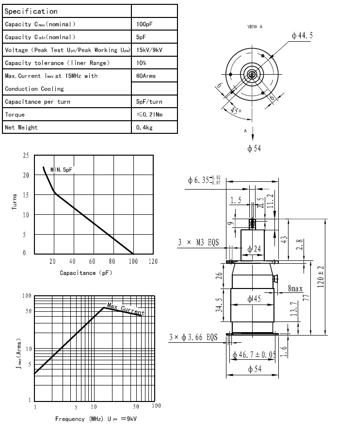 CKTB100/10/60型可变陶瓷高压真空电容器采用陶瓷外壳、真空介质、具有耐压高、体积小、Q值高、性能稳定可靠、价格低廉等特点,广泛用于感应加热、介质加热、通讯、广播等设备。