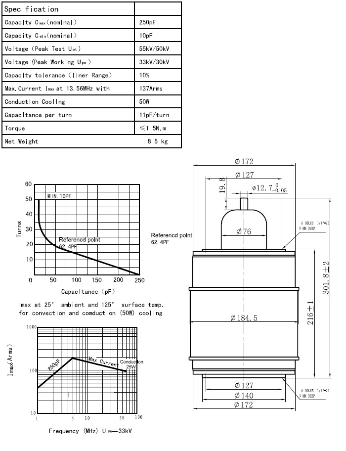 CKTB250/38/220可变陶瓷高压真空电容器采用陶瓷外壳、真空介质、具有耐压高、体积小、Q值高、性能稳定可靠、价格低廉等特点,广泛用于感应加热、介质加热、通讯、广播等设备。