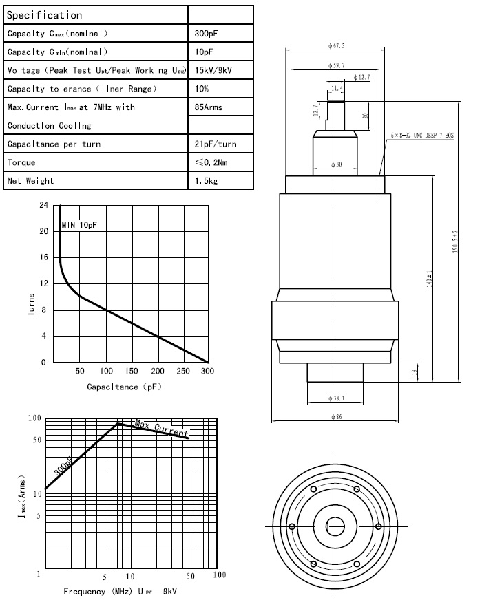 CKTB300/10.5/85可变陶瓷高压真空电容器采用陶瓷外壳、真空介质、具有耐压高、体积小、Q值高、性能稳定可靠、价格低廉等特点,广泛用于感应加热、介质加热、通讯、广播等设备。