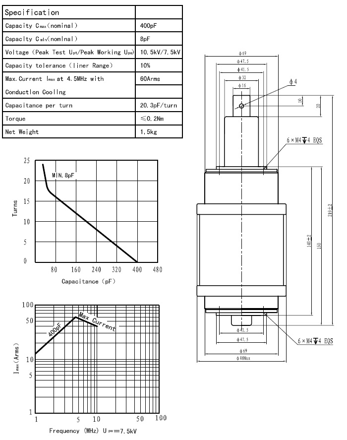 CKTB400/7.5/60可变陶瓷高压真空电容器采用陶瓷外壳、真空介质、具有耐压高、体积小、Q值高、性能稳定可靠、价格低廉等特点,广泛用于感应加热、介质加热、通讯、广播等设备。