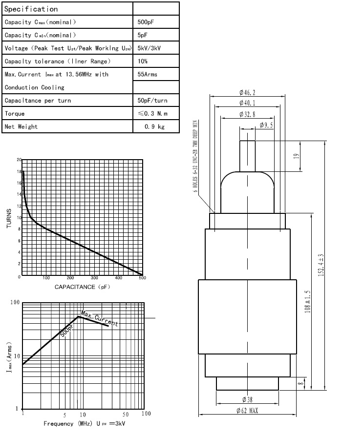 CKTB500/3.5/55可变陶瓷高压真空电容器采用陶瓷外壳、真空介质、具有耐压高、体积小、Q值高、性能稳定可靠价格低廉等特点,广泛用于感应加热、介质加热、通讯、广播等设备。