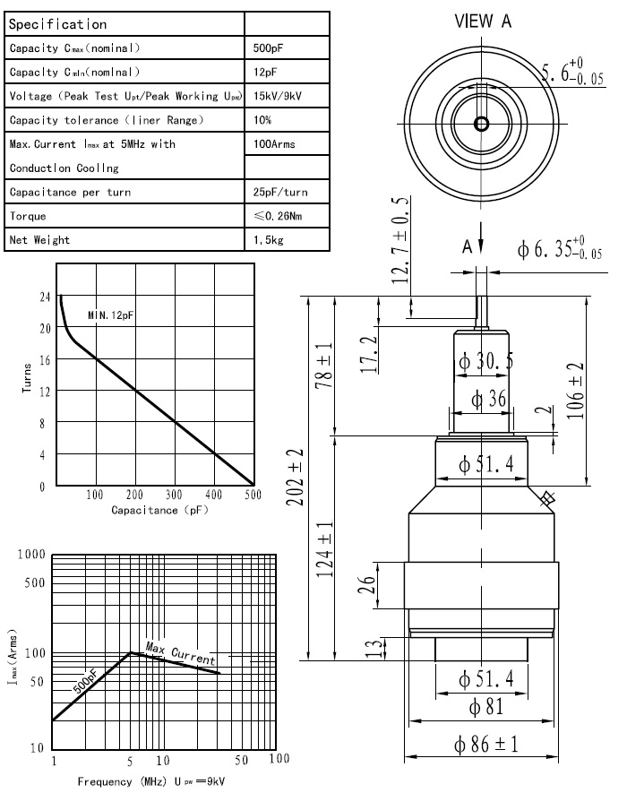 CKTB500/10/100(I)可变陶瓷高压真空电容器采用陶瓷外壳、真空介质、具有耐压高、体积小、Q值高、性能稳定可靠、价格低廉等特点,广泛用于感应加热、介质加热、通讯、广播等设备。