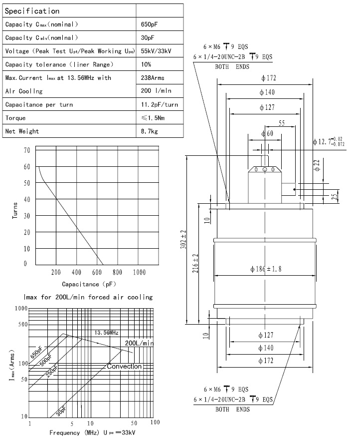 CKTBF650/35/238真空电容器采用陶瓷外壳、真空介质、具有耐压高、体积小、Q值高、性能稳定可靠价格低廉等特点,广泛用于感应加热、介质加热、通讯、广播等设备。