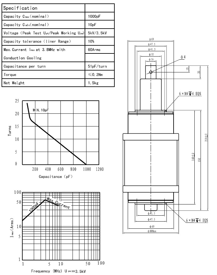 CKTB1000/3.5/60可变陶瓷高压真空电容器采用陶瓷外壳、真空介质、具有耐压高、体积小、Q值高、性能稳定可靠、价格低廉等特点,广泛用于感应加热、介质加热、通讯、广播等设备。