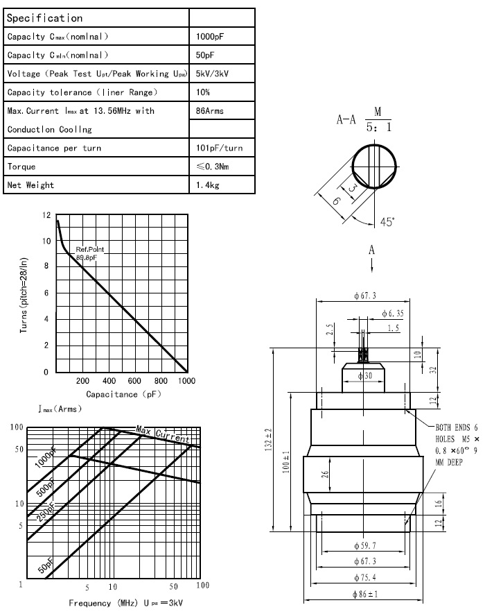 CKTB1000/3.5/86可变陶瓷高压真空电容器采用陶瓷外壳、真空介质、具有耐压高、体积小、Q值高、性能稳定可靠、价格低廉等特点,广泛用于感应加热、介质加热、通讯、广播等设备。