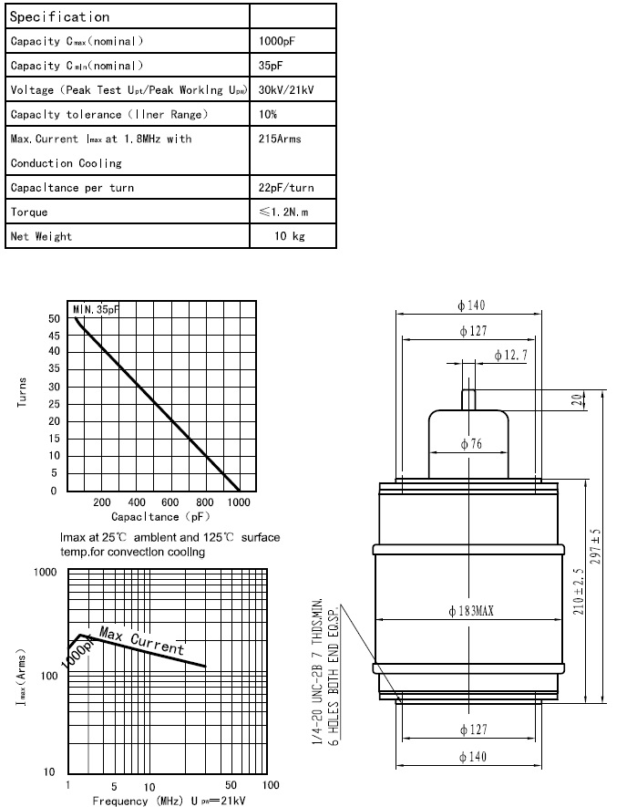 CKTB1000/21/215可变陶瓷高压真空电容器采用陶瓷外壳、真空介质、具有耐压高、体积小、Q值高、性能稳定可靠、价格低廉等特点,广泛用于感应加热、介质加热、通讯、广播等设备。