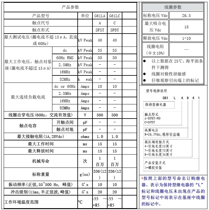 单刀单掷继电器G61L 保持型线圈,使继电器在无电源输入时保持继电器的状态。 设计紧凑,耐压达到35KV。 完全密封,可以使用数年。 充SF6气体,高压电容放电继电器。 绝缘高压引线,连接方便,可以按用户要求定制长度。 无触点弹跳问题。