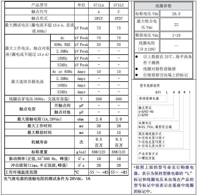 保持型线圈,使继电器在无电源输入时保持继电器的状态。 G71LA在约6.3立方英寸的体积(100立方厘米)下封装,耐压达到70KV,使你的系统体积最小。 充SF6气体,用于电容器放电,无X射线。 镀锡耐高压引线设计,方便连接。 无操作弹跳。 G71LC性能与G71LA一样。 单刀双掷用于极性转换或电源接通。