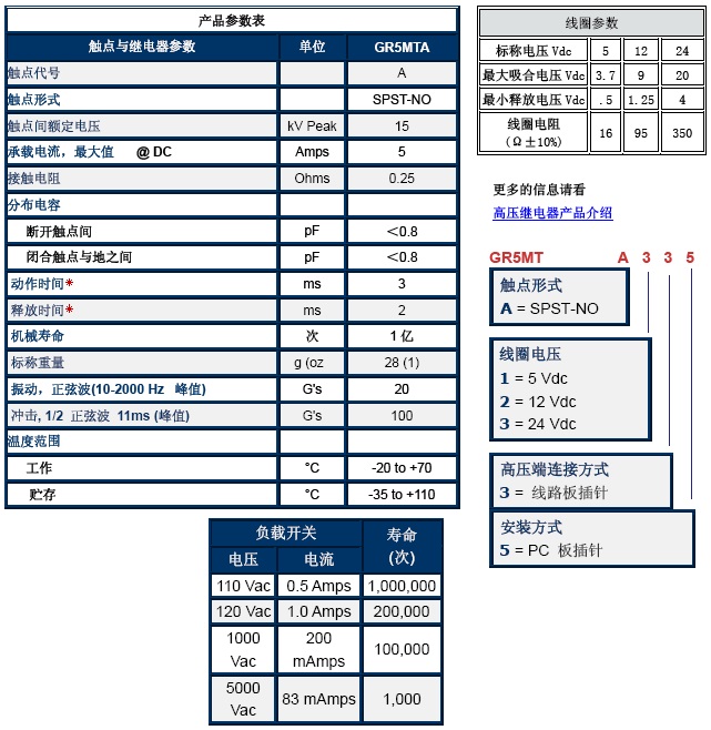 单刀单掷继电器GR5MTA体积小,可以处理射频大功率,电压高达15KV。线圈5V,12V,24V可以选择。真空介质,接触电阻低而且稳定。动作快,超长寿命,可达1亿次。