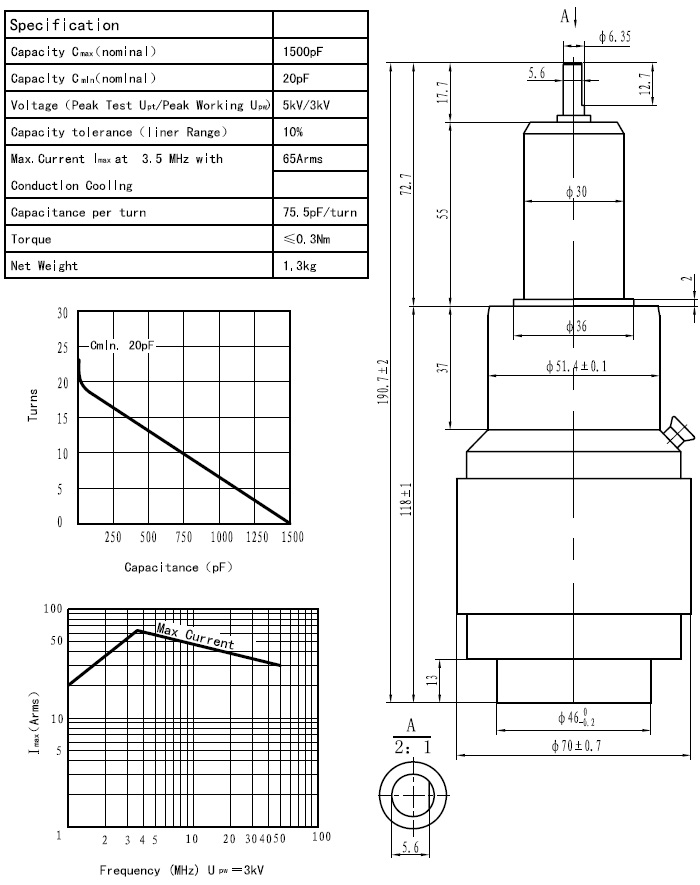CKTB1500/3.5/65可变陶瓷高压真空电容器采用陶瓷外壳、真空介质、具有耐压高、体积小、Q值高、性能稳定可靠、价格低廉等特点,广泛用于感应加热、介质加热、通讯、广播等设备。